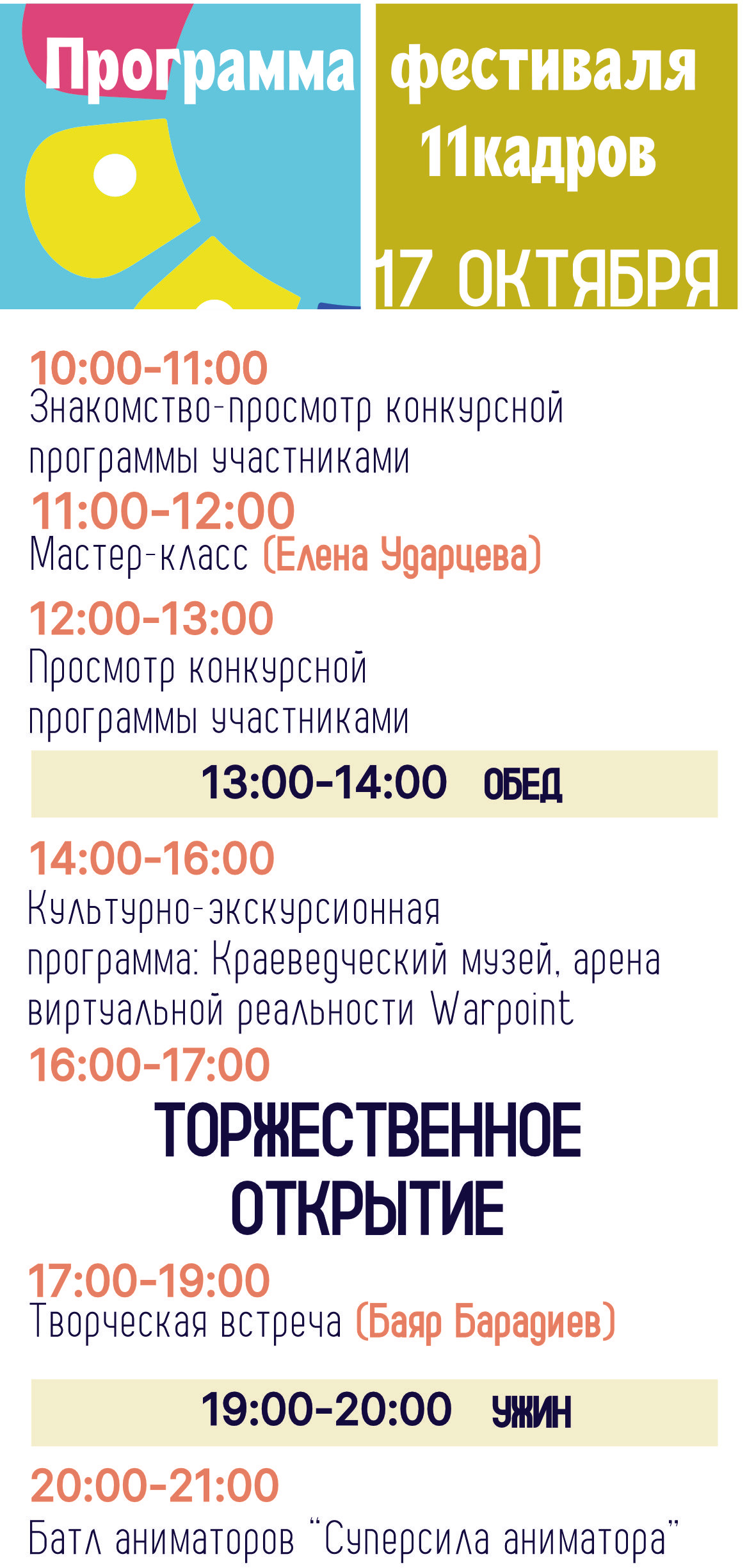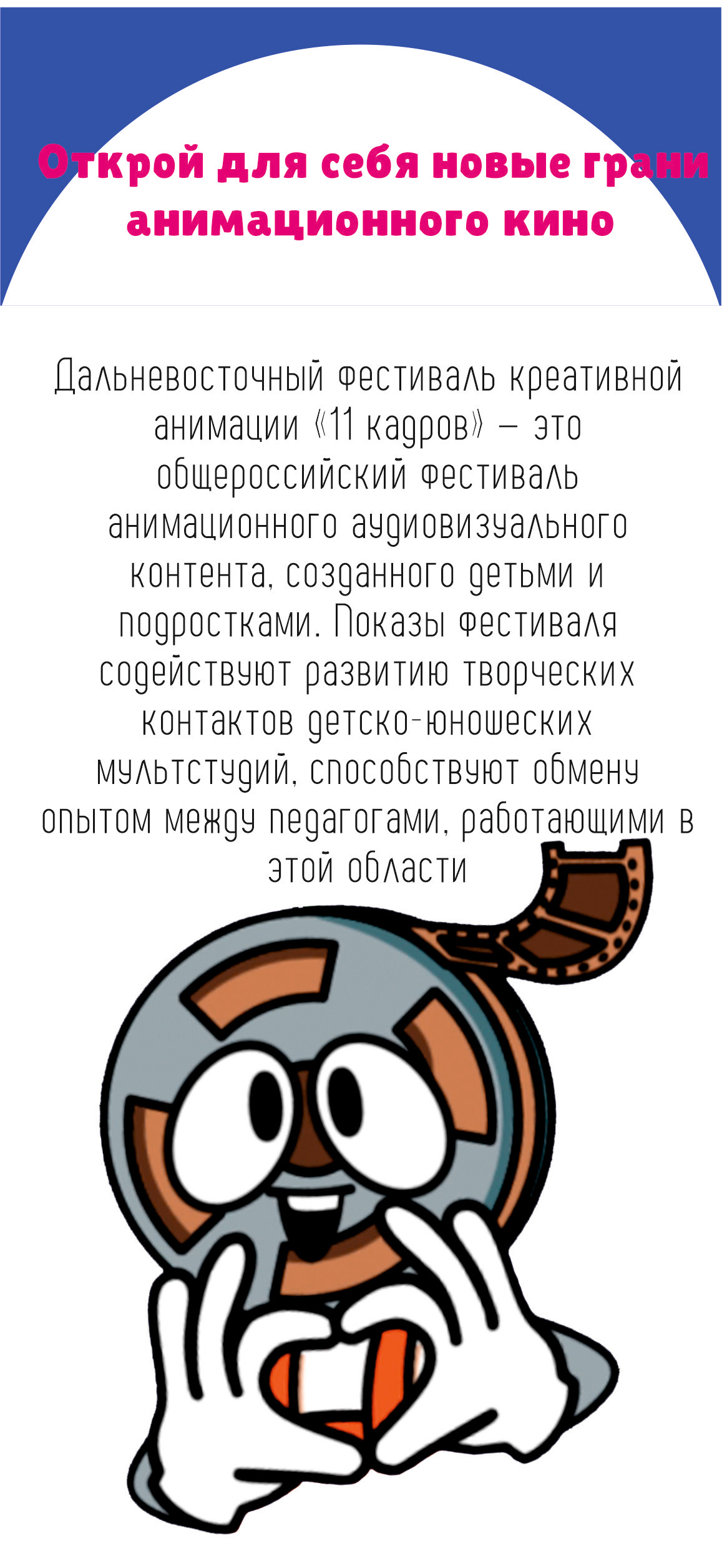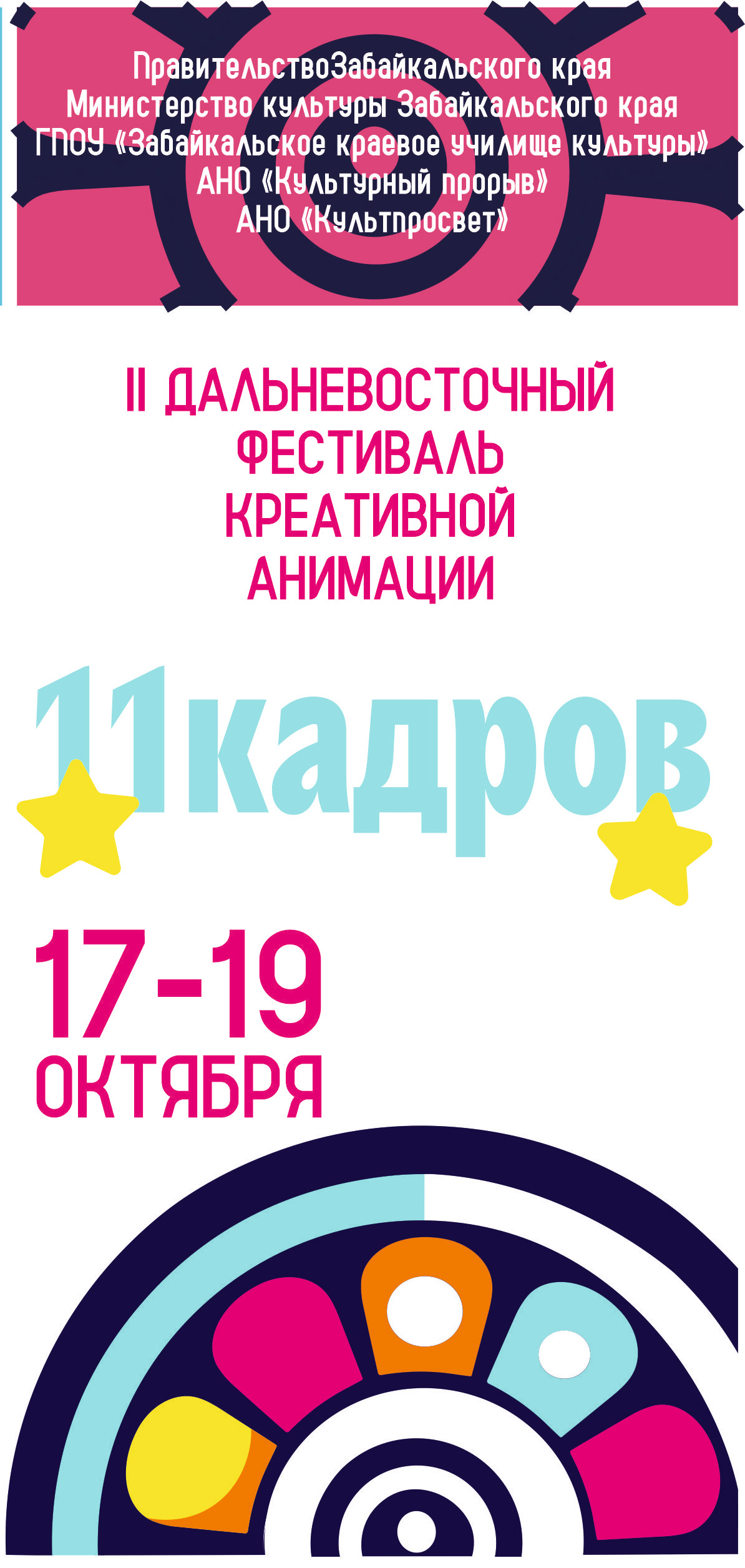 Дальневосточный фестиваль креативной анимации «11 кадров» – это общероссийский фестиваль анимационного аудиовизуального контента, созданного детьми и подростками. Показы фестиваля содействуют развитию творческих контактов детско-юношеских мультстудий, способствуют обмену опытом между педагогами, работающими в этой области