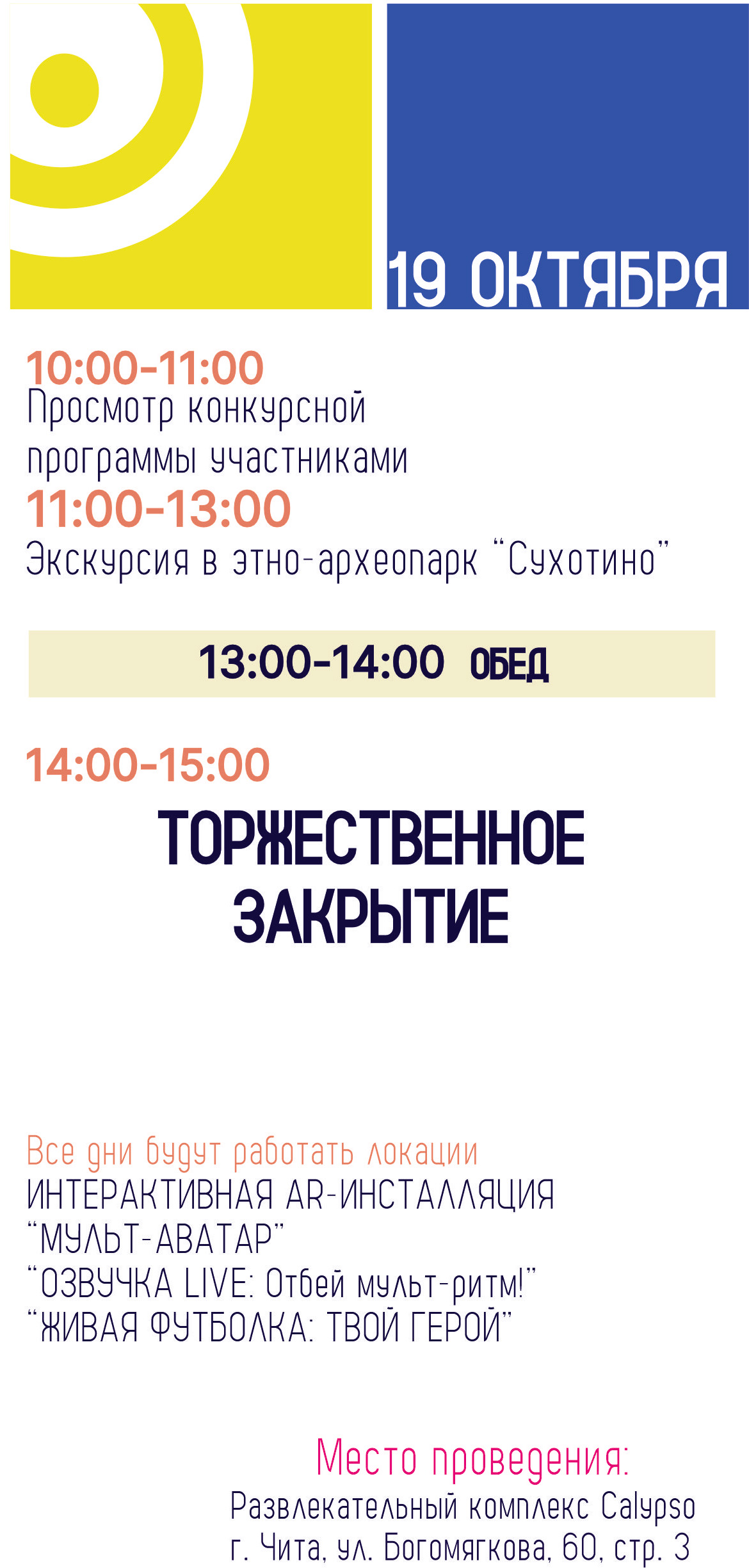 Все участники, подавшие заявки и приславшие конкурсные работы, приглашаются на фестиваль, который состоится с 17-19 октября 2025 г.   по адресу: г. Чита, ул. Красной звезды, 7, Школа креативных индустрий